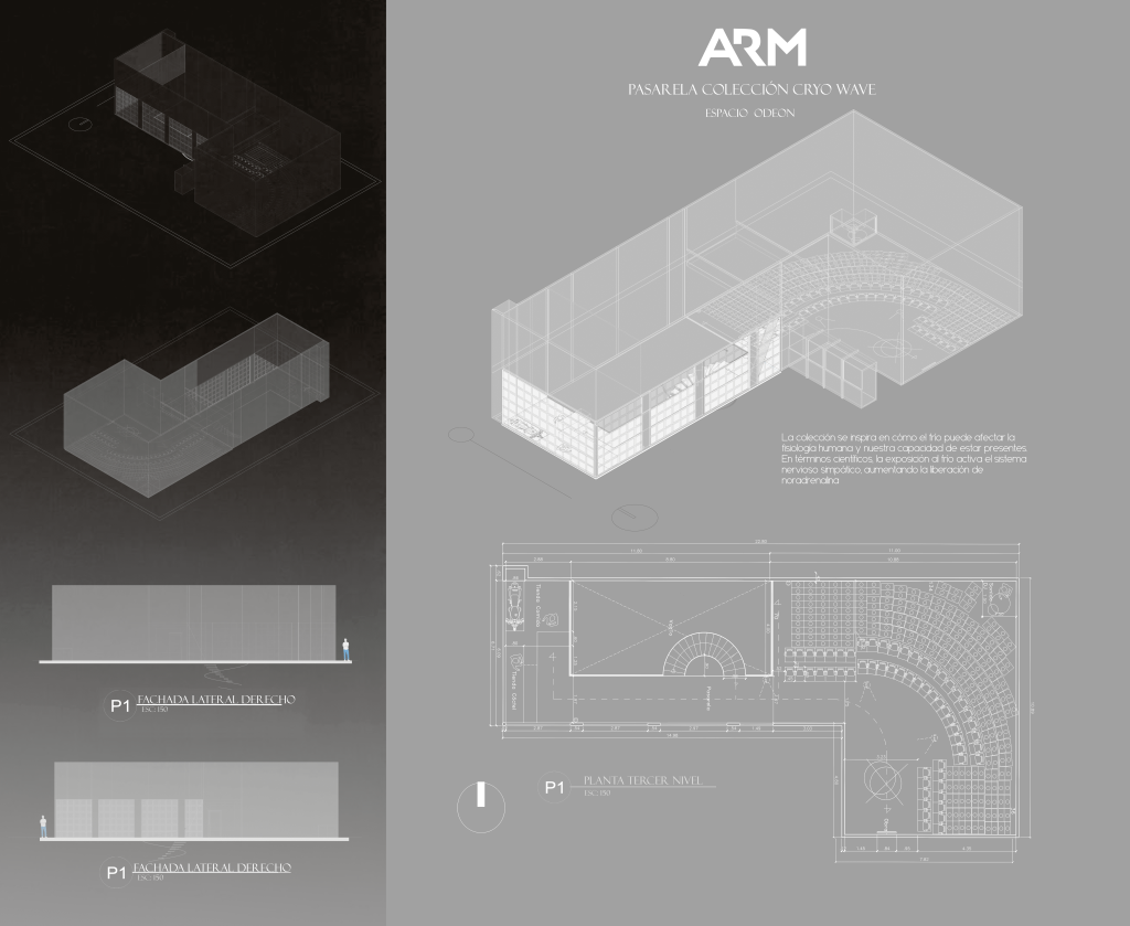 En una sociedad sobreestimulada, el frío representa contención. Se tradujo este concepto en un espacio blanco, con iluminación gélida y elementos metálicos. La pasarela fue limpia, precisa y contemplativa.